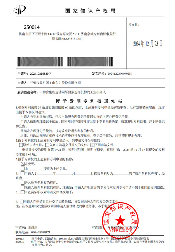 熱烈祝賀三維漢界機器(山東)股份有限公司首席科學家山顯雷教授親自主導研發的 “一種含集成運動副平面多連桿機構的工業機器人” 成功獲得中國發明專利授權!